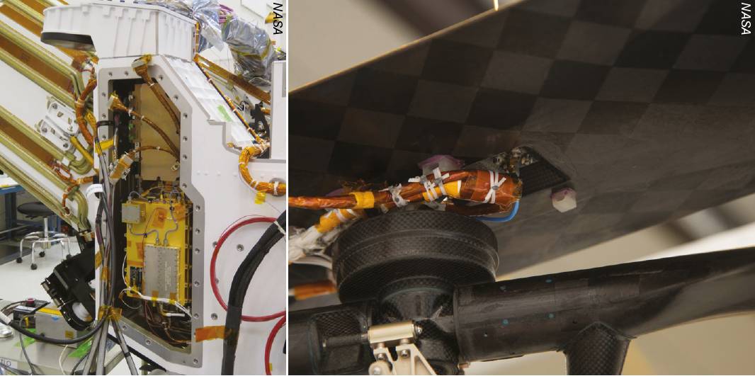 Above left: The Mars Helicopter Base Station – the gold-coloured box near the back of the Perseverance rover stores and routes communications between NASA’s Ingenuity Mars helicopter and mission controllers on Earth. Above right: The Ingenuity carries a small swatch of muslin material taken from the wing of the Wright Brothers Flyer 1. NASA