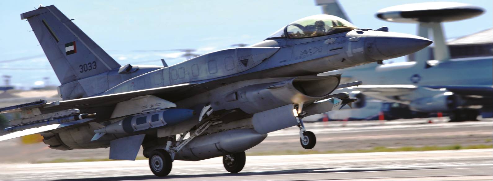 A United Arab Emirates (UAE) air force F-16E Fighting Falcon aircraft from Al Dhafra Air Base, UAE, takes off for a training mission.Michael R. Holzwort/USAF